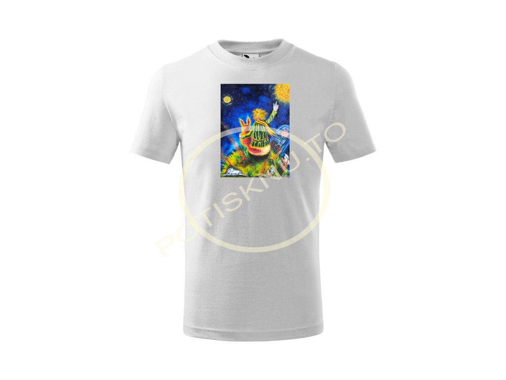Tričko s motivem malého prince - kopie obrazu Niny Danišové. Nenalezli jste barvu trička, která by se Vám líbila, nebo byste rádi motiv např. na šatech či mikině? Kontaktujte nás, rádi Vám vyhovíme a připravíme textil dle Vašeho přání.